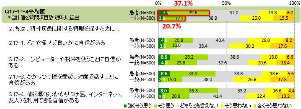 ・精神疾患に関する情報入手に自信を持つ人は、一般の人で20.7%、患者さんでも37.1%に留まる