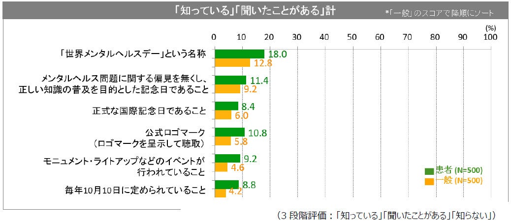 ・「世界メンタルヘルスデー」の認知は、一般の人で12.8%、患者さんで18.0%