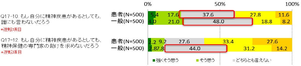 また、精神疾患になった場合に専門家のサポートを求めることについて、一般の人の44.0%が「どちらとも言えない」と回答しており、受診への躊躇が見受けられる。