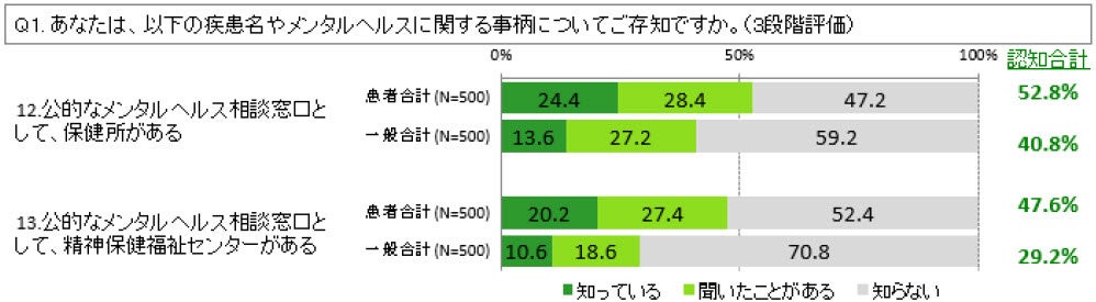 公的なメンタルヘルスの相談窓口として、保健所の認知は、患者さん、一般の人それぞれ52.8%、40.8%、精神保健福祉センターの認知は、患者さん、一般の人それぞれ47.6%、29.2%であった。