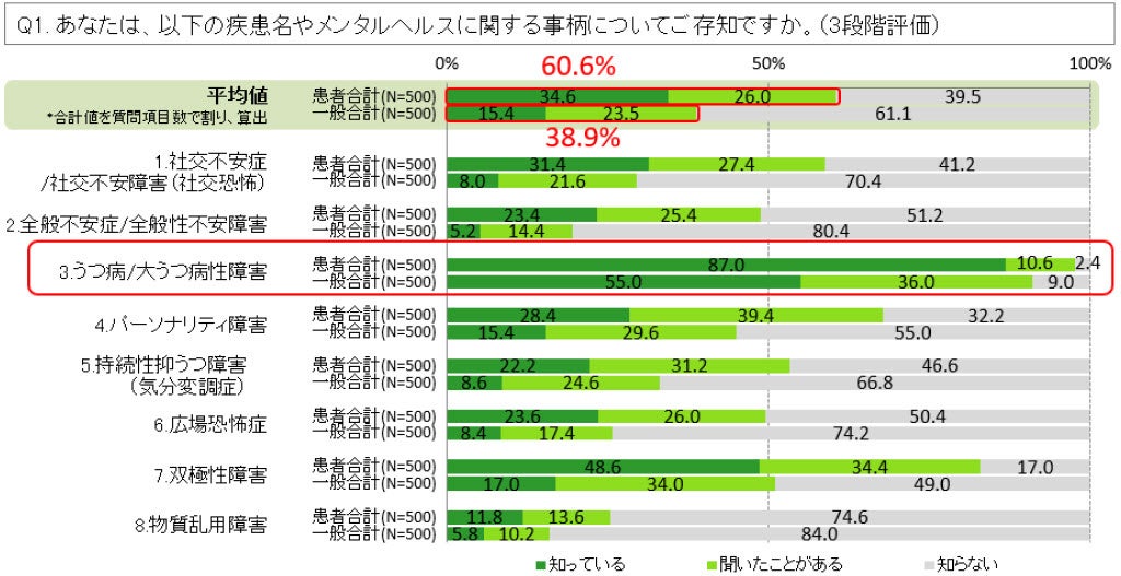 1.主な精神疾患8種の認知度の平均は、患者さん60.6%に対して一般の人は38.9%