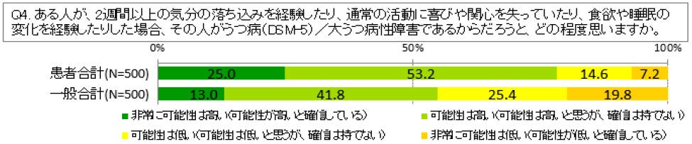 うつ病の認知が一般の人・患者さんとも高い一方で、一般の人はうつ病の症状を理解していない人が45.2%であった。疾患名の認知はあっても、具体的な症状の理解には至っていない方が多いことが明らかになった。