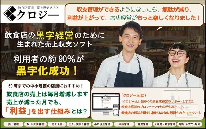 飲食店専用収支ソフト『クロジー』利用者の約90%が黒字化成功!新機能追加リニューアルにつき限定20名様3カ月間無料モニター募集!独自カスタムで無駄を削り、利益を出すノウハウが手に入る!