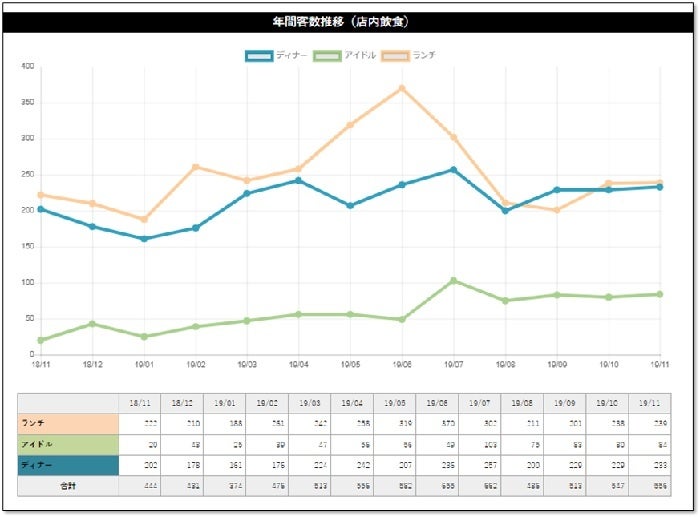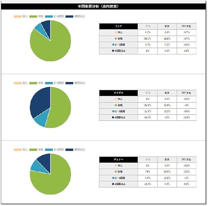 特に新規客、リピート客、ヘビーユーザー、知人、割引チケットを使用したお客様などの顧客分析を行うことで、どのような客層が来店しているのか?が月ごとに一覧表示が可能です。スタッフとのミーティングやメニュー開発、客単価の分析などに強い味方となることは間違いありません。