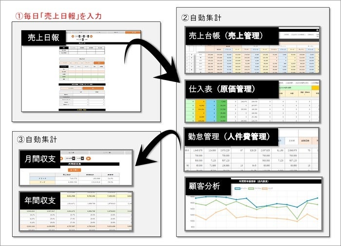 売上収支ソフト「クロジ―」は飲食店専用に開発されており売上金はもちろん、カード売上、現金売り上げ、家賃、光熱費、バイトの人件費、仕入れ、小口現金の使途、などを収支ソフトに打ち込むことで日々の収支が計算出来て今日現在の人件費や仕入れ額、小口現金の残高なども把握出来ます。そして、毎日約10分程度の「売上日報」入力作業で、次の5つの売上表、仕入表、勤怠管理表、顧客分析、月間収支表、年間収支表が自動で作成されます。