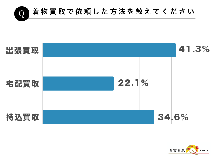 着物買取は「出張買取 / 宅配買取 / 持込買取」の3種類の買取方法がある中、実際の利用者はどの方法を選択したのかアンケートを行いました。