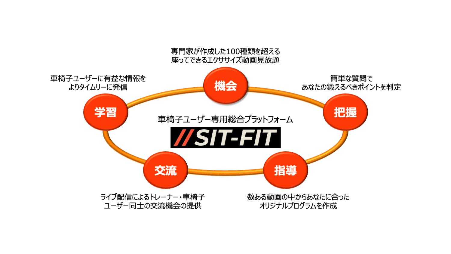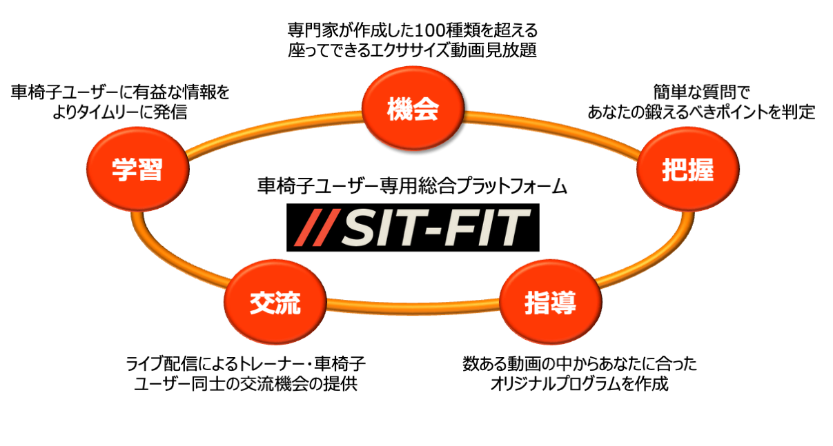 車椅子ユーザーに対して“5つの要素(機会・把握・指導・交流・学習)”から構成され、運動習慣のある健康的な生活に繋げるための支えとなるオンラインプラットフォームです。