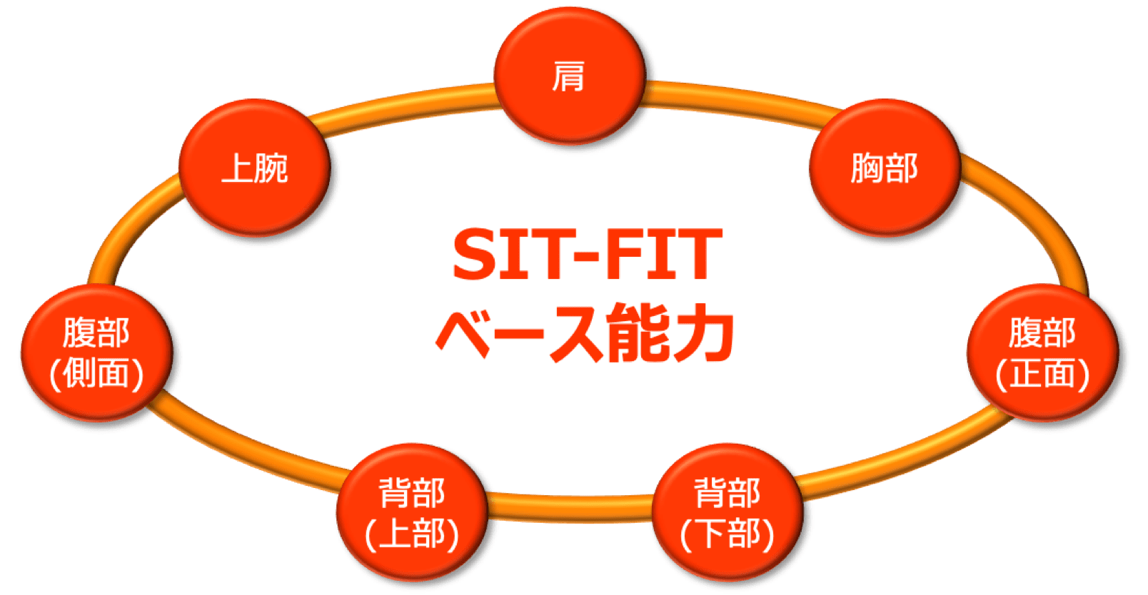 車椅子生活において体幹・上肢の7部位の能力維持・強化(悪化予防)は不可欠です。これらの部位について「SIT-FIT ベース能力」と位置付けています。