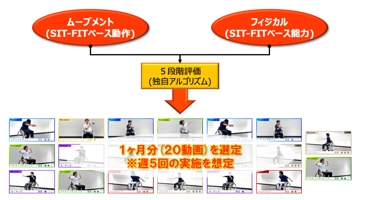 簡単な質問に答えるだけで弊社独自アルゴリズムにより「ムーブメント」・「フィジカル」それぞれ“5段階評価”を行い、その結果を踏まえて100種類以上ある動画の中から適したものを“1ヶ月分(20動画)”選定して、一人ひとりに合ったパーソナルプログラムを作成・提供します。(週5回の実施を想定)