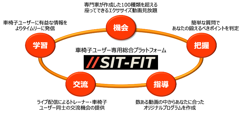 このような車椅子ユーザーを取り巻く課題の改善に寄与すべく、当該層への訪問パーソナルトレーニングサービスを通じて長年培ってきた経験・ノウハウ・専門知識を駆使したオンラインプラットフォームサービス『SIT-FIT』を開発しました。