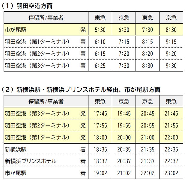 東急田園都市線市が尾駅から羽田空港まで約40~60分で結び、朝4便は市が尾駅から羽田空港まで直行、夕夜間4便は羽田空港から新横浜を経由し市が尾駅まで運行いたします。