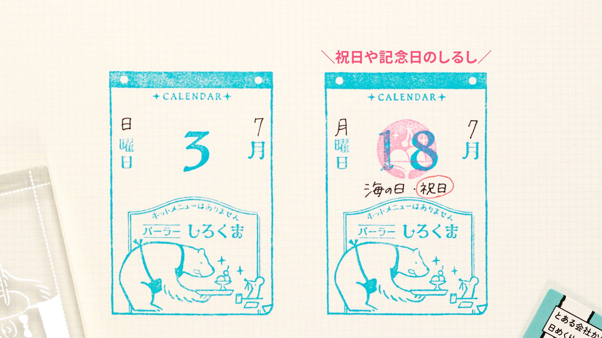 日本での日めくりカレンダーのはじまりが「企業の粗品(販促品)」ということから、「とある会社からの粗品」をテーマとして、エレファント活版印刷、フクロウシステムズ、パーラーしろくま という動物が営む3種類の企業のカレンダーデザインを取り揃えました。