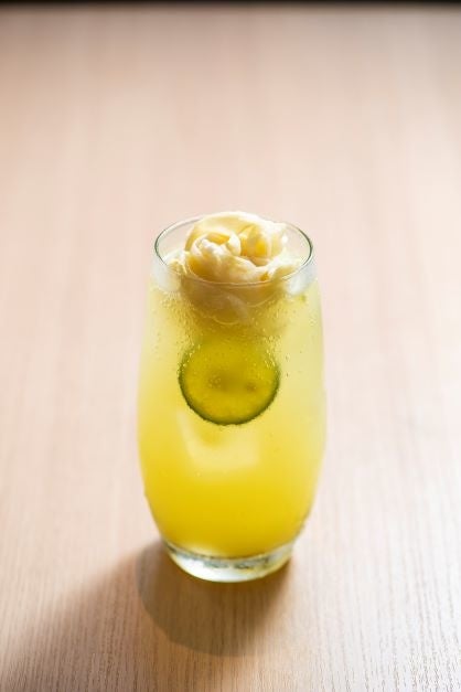 寿司店に欠かせない「ガリ」と、まるでフルーツかと思わせるジャンジョンブルピューレのほど良い酸味が食欲を刺激する、こだわりのジンジャーカクテル。