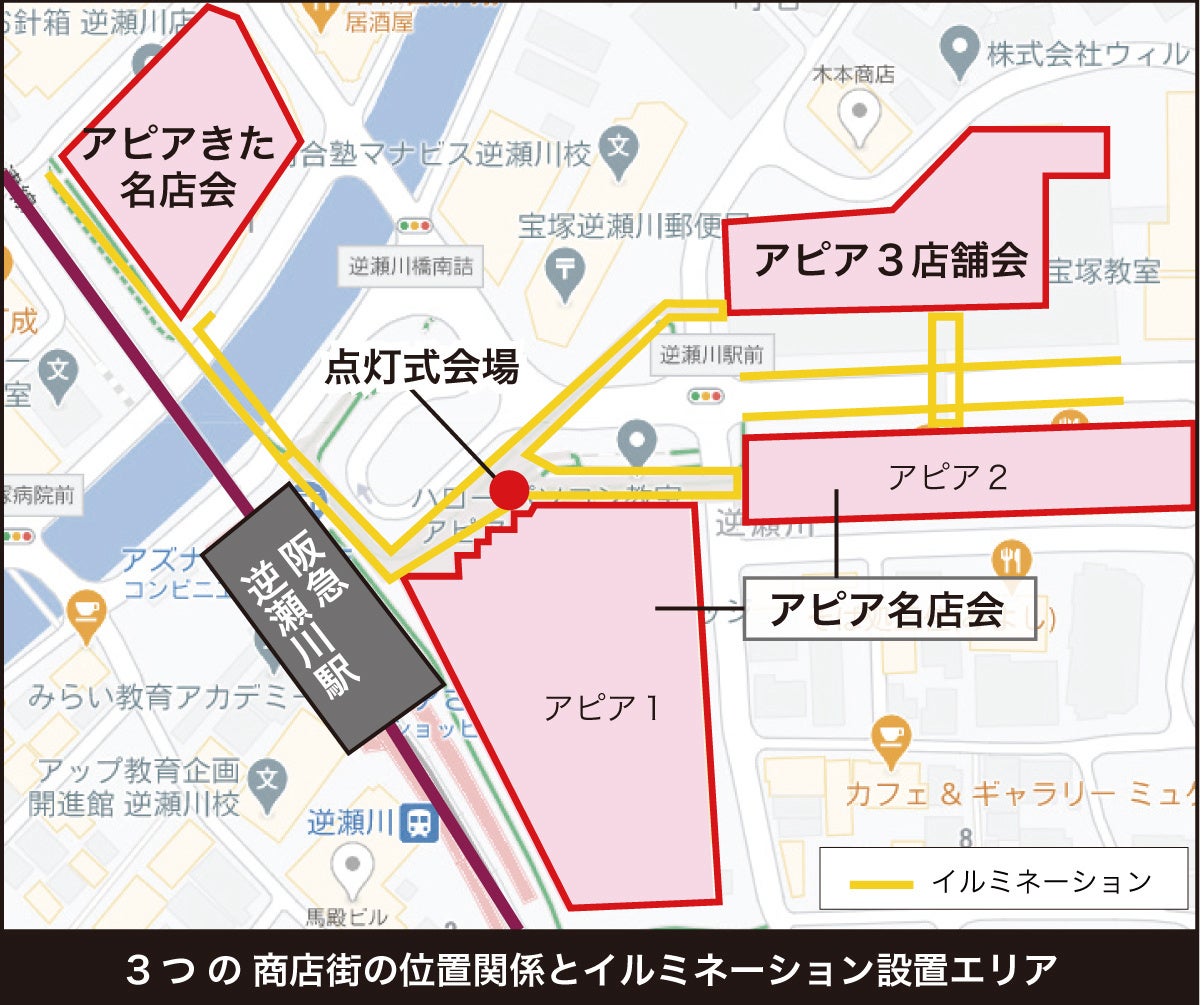 経済産業省主管「がんばろう!商店街事業(旧:GoTo商店街事業)」で、3つの商店街が結束。イルミネーション点灯式を皮切りに4つの事業を実施し駅前活性化を狙う
