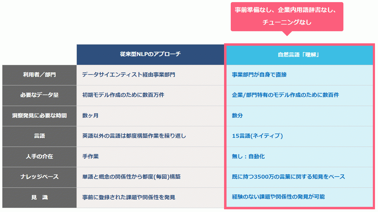 一般的に自然言語処理(NLP)技術を駆使したテキストマイニングではテキスト解析精度を上げるために多くの事前準備が必要でした。特に日本語の課題として形態素解析の精度向上や組織や企業内部だけで利用されている組織内辞書を用意した上でチューニングをするなど、専門的作業を行った上で利用されていました。更に辞書のメンテナンスなど継続して精度を維持する必要もあり、継続的な活用には大きな労力が必要です。