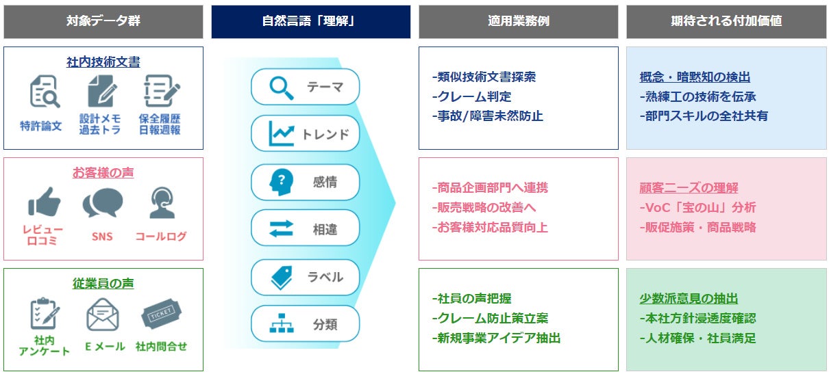 業務で使うデータには、社内技術文書、お客様の声、従業員の声などの自然言語データがたくさんあります。ここにこの度の自然言語理解AIによる解析を加えることで、これまで対象にしにくかったテキスト解析を通じた課題解決にすぐに取り組めるようになります。