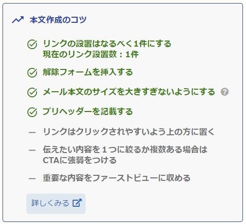 本機能では、弊社が培ってきたノウハウから開封率とクリック率を上げるポイントをメール作成画面などに表示し、内容のチェックを行うことで、皆様のメール作成をサポートします。