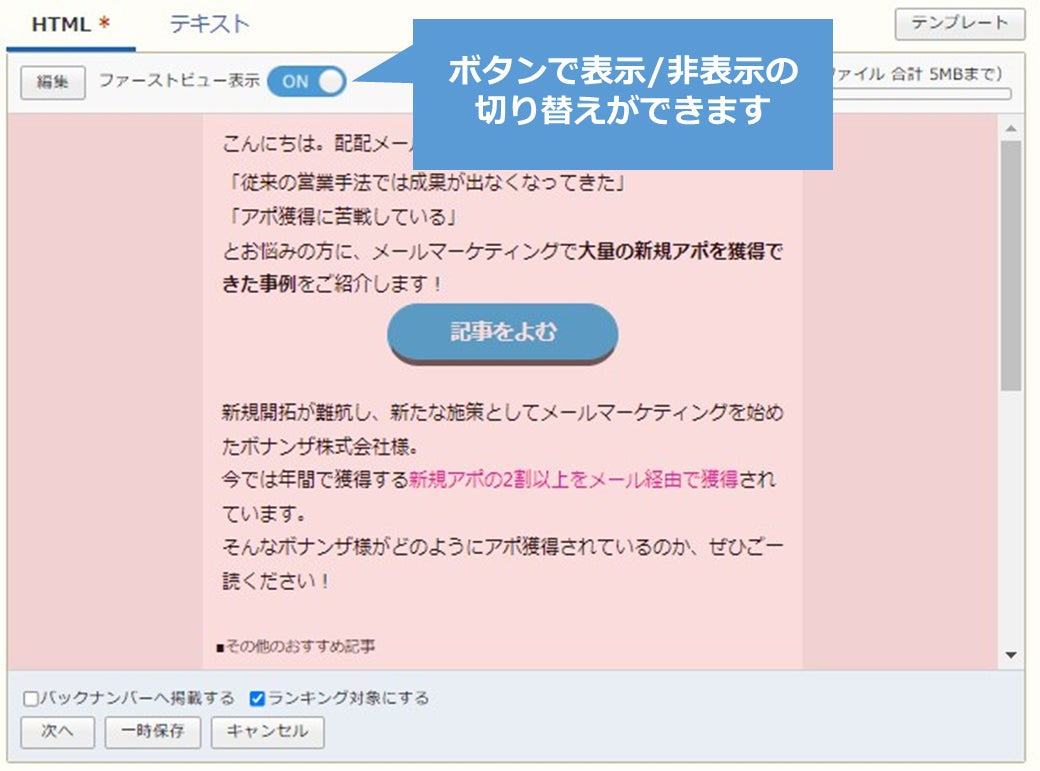 これにより、メールを作成しながらリンクがファーストビューに入っているかどうか簡単に確認することができます。