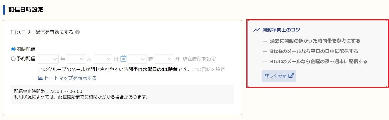 「いつ配信するか」といった配信タイミングも開封率を上げるためには重要なポイントになります。メールの配信日時を設定する画面では、BtoB/BtoCそれぞれの開封されやすい時間帯などを記載しています。