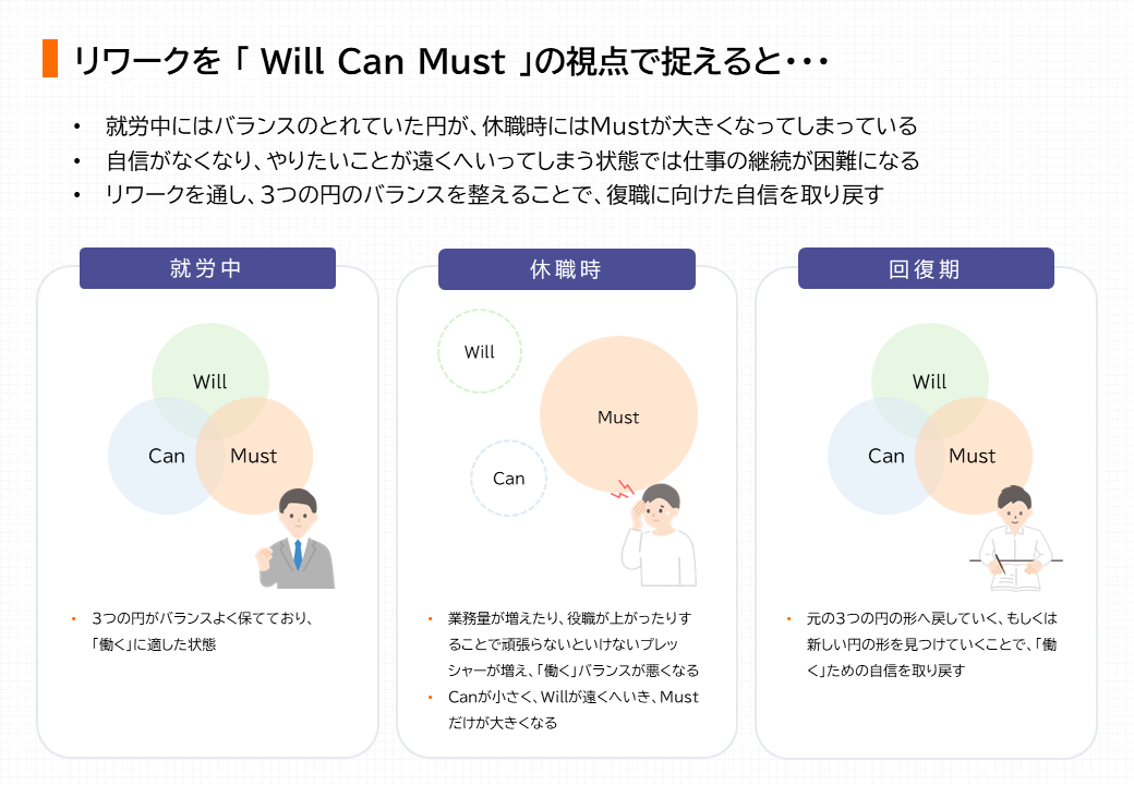※リワーク:「return to work」を略した言葉で、文字通り「復職(休職者が仕事に復帰)」の意味となりますが、「精神的な不調により休職した方の職場復帰をサポートするためのプログラム」という意味も含めて使われることが多くなっております。