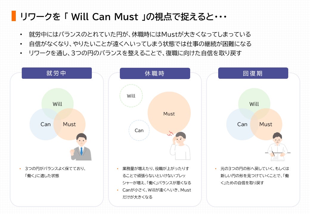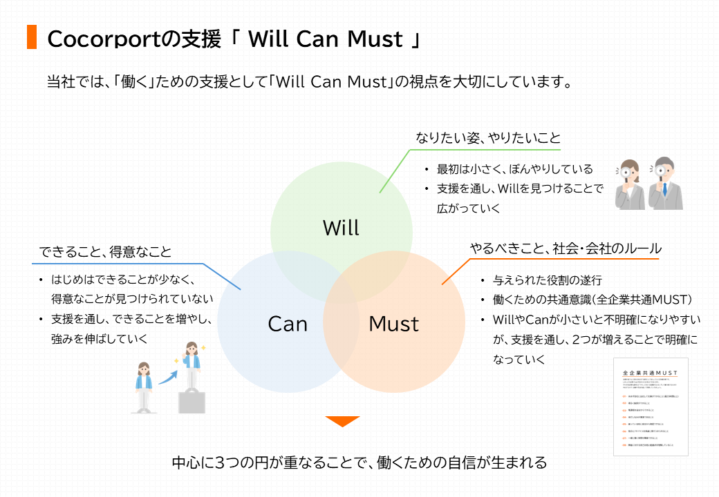 当社では、「働く」ための支援として「Will Can Must」のフレームを活用した支援を提供しており、その考え方を基礎にしたプログラム提供を行ってまいります。