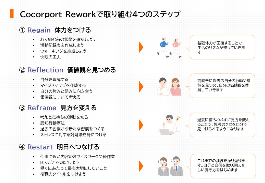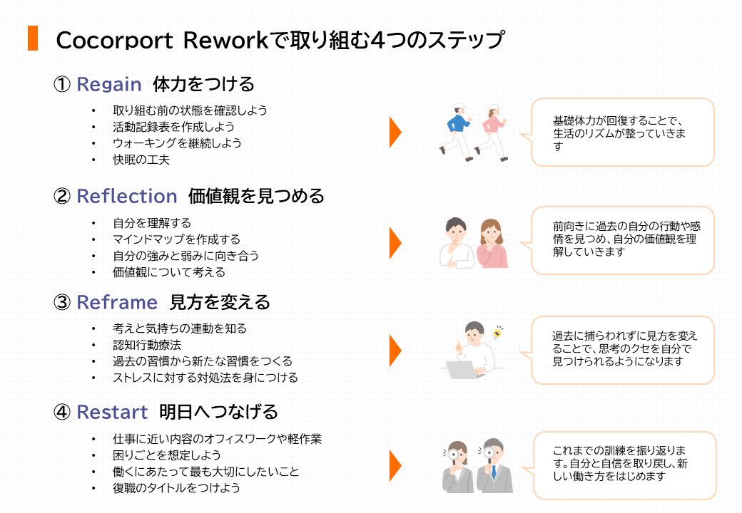 詳細:当社HP「リワーク(復職支援)とは | 障がい者就労移行支援のCocorport」https://www.cocorport.co.jp/about_ikou/rework/
