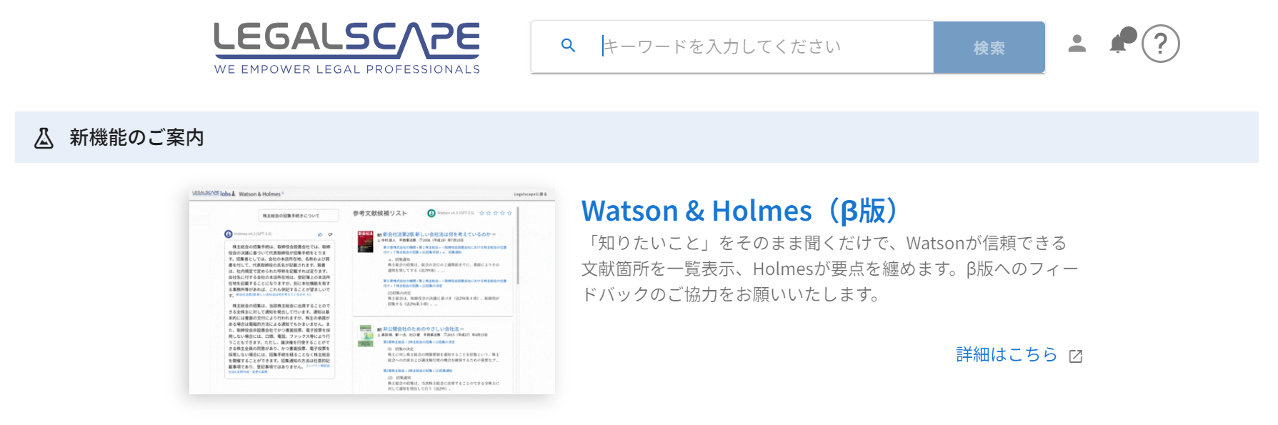 今回、その研究開発結果を、1万人を超える法務パーソンの皆様方にご利用頂いておりますリーガルリサーチプラットフォーム「Legalscape」に、 “Watson & Holmes” のオープンβ版として組み込むことにより、皆様方の大幅なリサーチ体験向上を見込んでおります。
