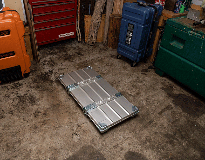 アルミ合金製にして、慣れれば1分程で組み立てられる可変機構。41.0cmのコンテナ高さが、折りたたむと10.6cmのコンパクトサイズになる運用性の高さという特長をもって、その輸送効率、経済パフォーマンスの高さから、様々なプロフェッショナルの現場や店舗什器、個人のガレージ空間の中心に据えるインテリアなど、PROTEX製品の中でも指折りの運用実績を持つコンテナです。