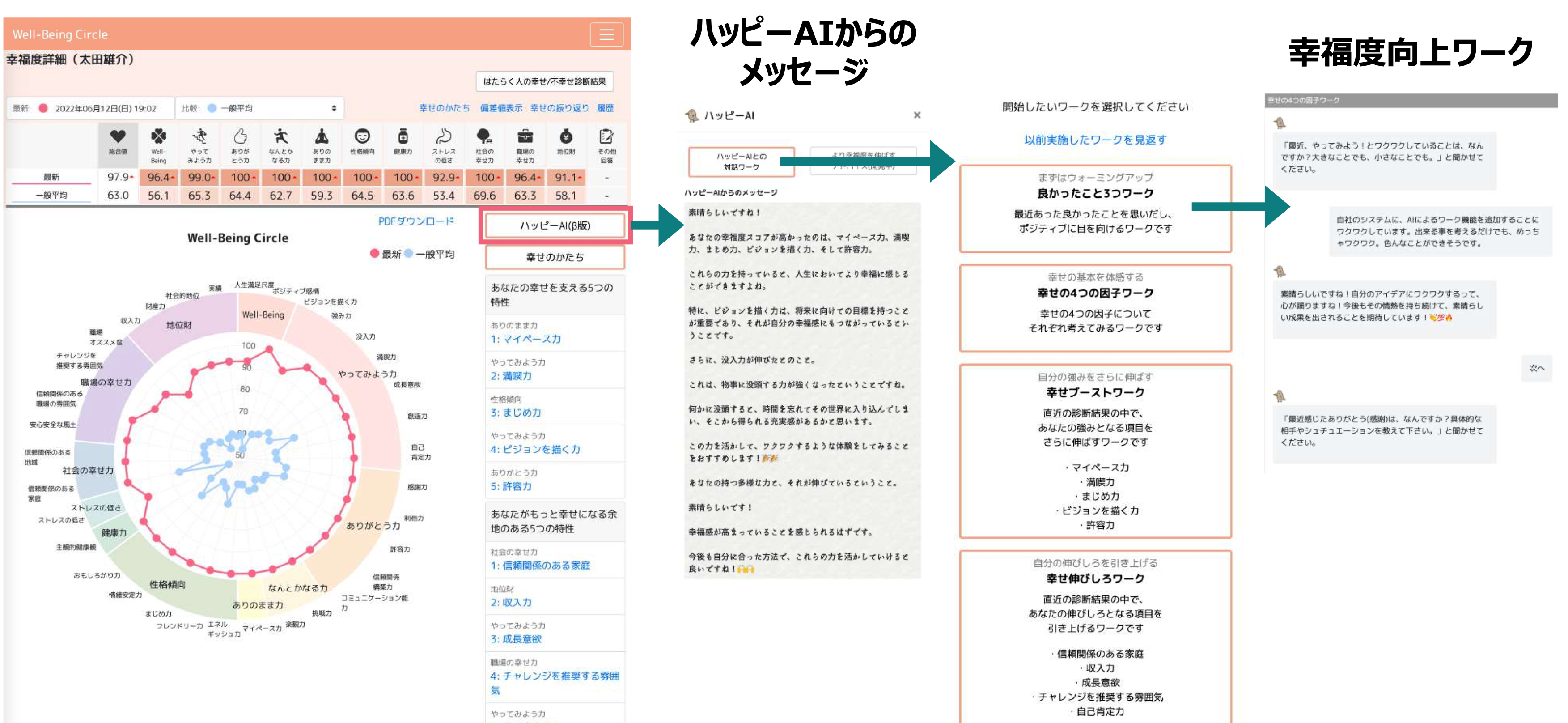 また、それに併せて、今世間を賑わせているchatGPTの自然言語処理の人工知能モデルを利用して、幸福度診断結果へのメッセージや、診断結果を元に幸福度を向上させるワークを行うことができるハッピーAI機能(β版)をリリースいたしました。