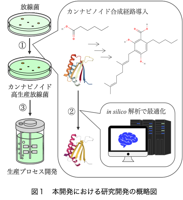 委託フェーズとして①放線菌宿主によるカンナビノイド化合物生産菌の確立、及び②in silico 解析による酵素探索・改変および代謝改変の予測法の開発と実践を実施します。(図1)委託フェーズでは、最終的にCBGA 100 mg/Lでの生産を目指します。助成フェーズでは、③ジャーファーメンターでの高生産性株およびタンク培養レベルでの製造法の開発を実施します。③では、①、②により取得したカンナビノイド高生産菌を用いて段階的にスケールアップしつつ、高生産するための培養条件等の検討を進めます。本工程ではCMOやバイオファウンドリ拠点を活用し、最終的にCBGA 1000 mg/Lでの生産を目指します。