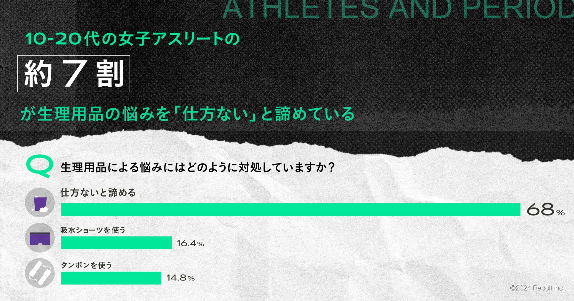 アンケートでは、女子ユースアスリートの約7割が、生理用品による悩みを「仕方がないと諦める」と回答するなど半数以上のアスリートが「隠れ我慢」をしていることが明らかに。日本でもFemtech市場は徐々に大きくなり、選択肢も増えてはいますが、スポーツ界には情報がまだまだ届いていない現状が伺えます。