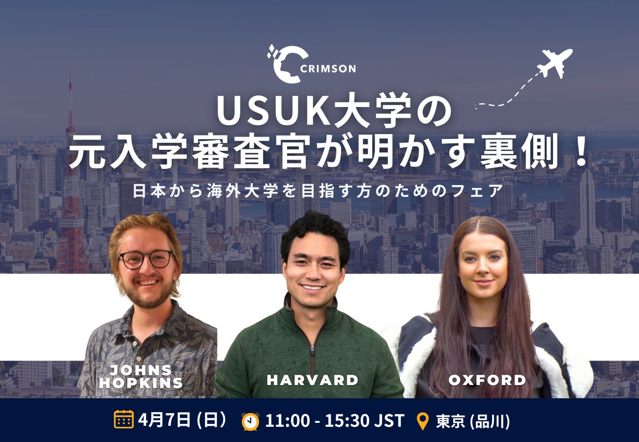海外進学塾「Crimson Education」(クリムゾン・エデュケーション)では、2024年4月7日(日)に「元入学審査官が明かす裏側!海外大学進学フェア」を開催することが決定いたしました。