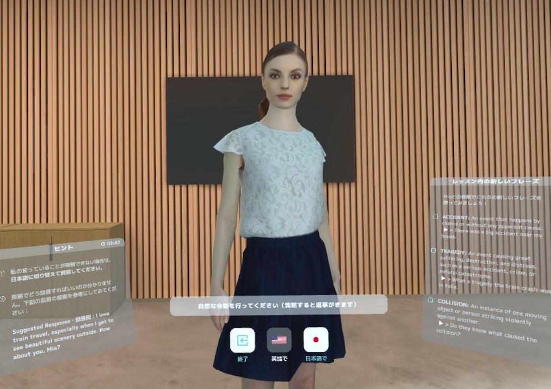 株式会社プラスワン・ジャパンは、VRおよびAI技術を活用した英会話トレーニングソフト「Smart Tutor(スマート・チューター:https://www.plusone.space/)」の販売を行っています。これまではVR空間上の仮想人物を相手に、ビジネス会議や会食での会話など決められたトピックを題材とした英文リーディングや翻訳・要約などの練習が中心であったため、フリートークの練習には限界がありました。