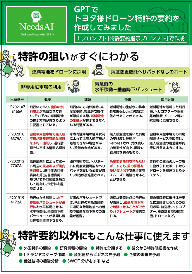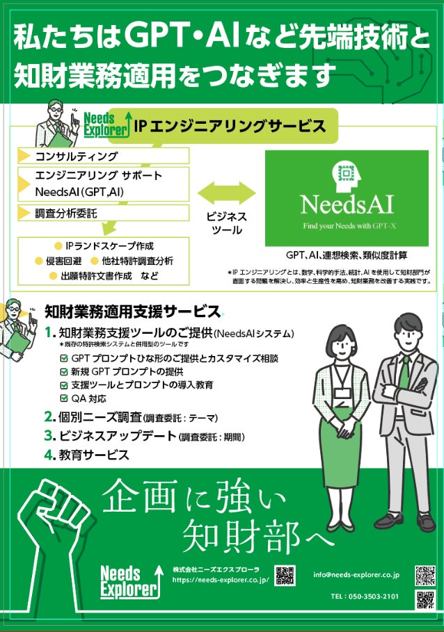 ニーズエクスプローラ社は企業経営、知財コンサル、研究所、ソフト開発のベテランが、生成AIや自然言語処理関連ツールの導入と知財業務への適用(プロンプト開発・保守)をご支援いたします。