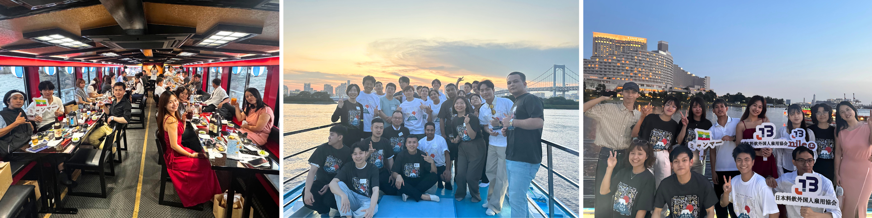 当協会では、支援している外国人に対して、在日期間を就業だけを目的とするのではなく、文化や日本ならではの体験を提供する目的で、交流会を定期開催しています。今回は江戸時代から続く伝統的な文化の一つである「屋形船」でのイベントを開催しました。特定技能で働く、ミャンマー、ベトナム、ネパール、ウズベキスタン、中国、台湾、スペイン出身の外国人が35名集まり、お取引先企業の担当者を含めた総勢60名で、船の中から見る東京湾の夜景や和食を堪能しました。