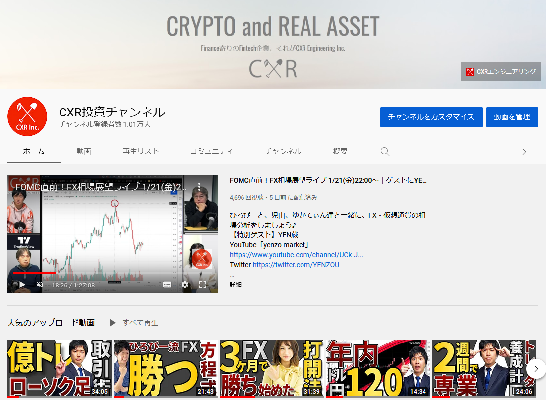 サブチャンネルとして、仮想通貨(暗号資産)に特化した「CXR仮想通貨チャンネル」や、アニメーションで金融知識を分かりやすく学べる「20代から始めるお金の増やし方」も運営しています。