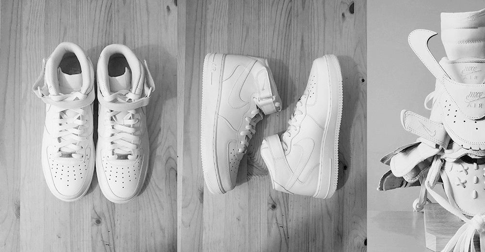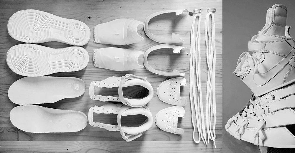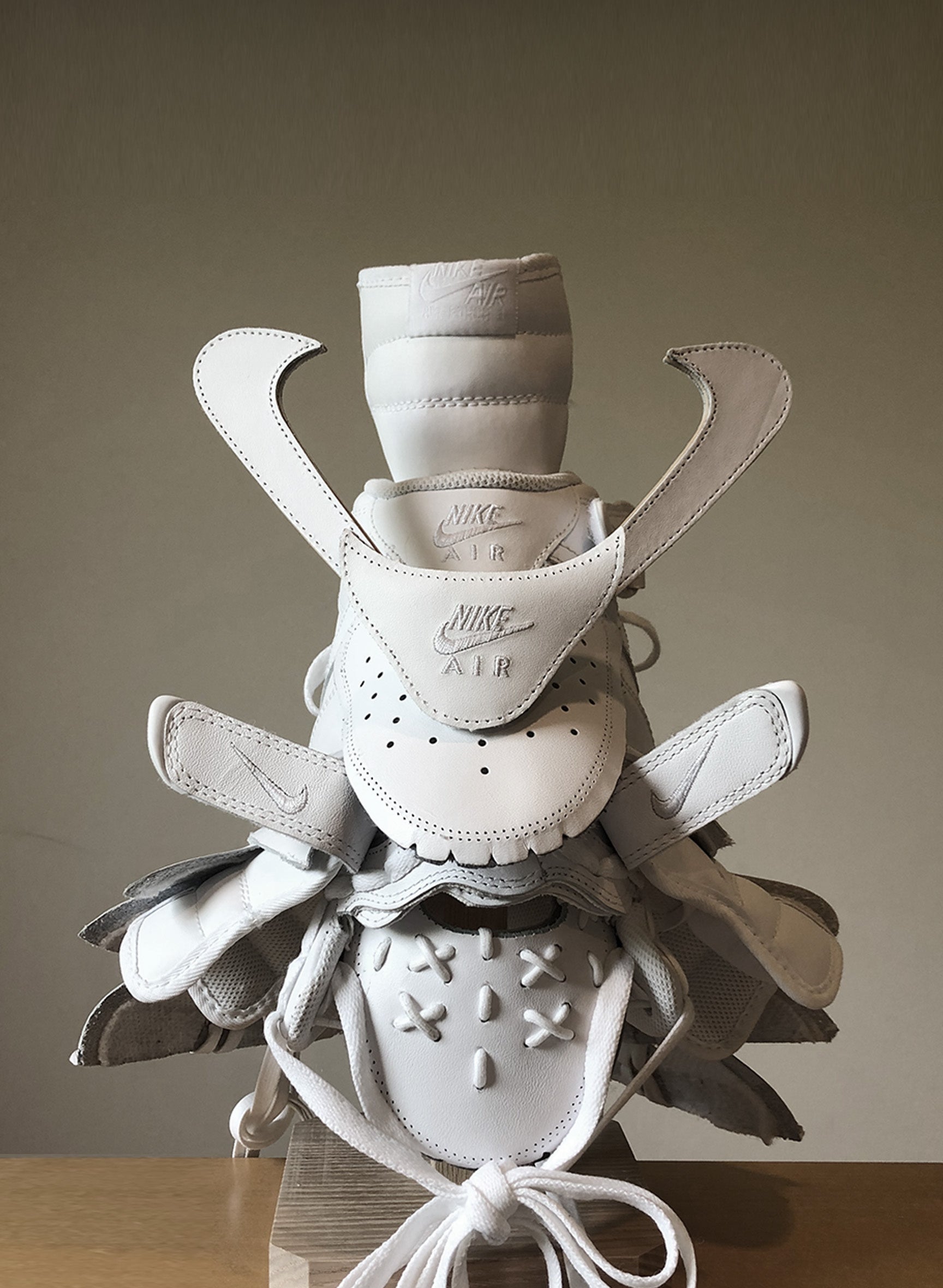 「この世界は日本人としてのあなた(自身のオリジナル)のもの」というメッセージのもと、スニーカーで五月人形の兜を制作。兜は当時の武将たちの強い信仰と意志が込められています。機能とデザインが常に進化し「現代の甲冑」ともいえるスニーカーを分解し、再構築します。