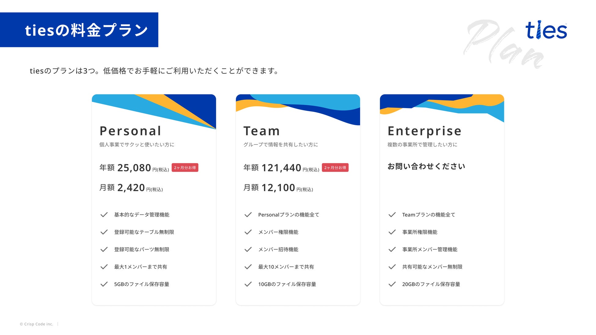 この経験からシステムを人やデータを繋げる = ties (tieの複数形) と名付け、数多くの企業に利用いただきたいと思い開発を続けてきました。