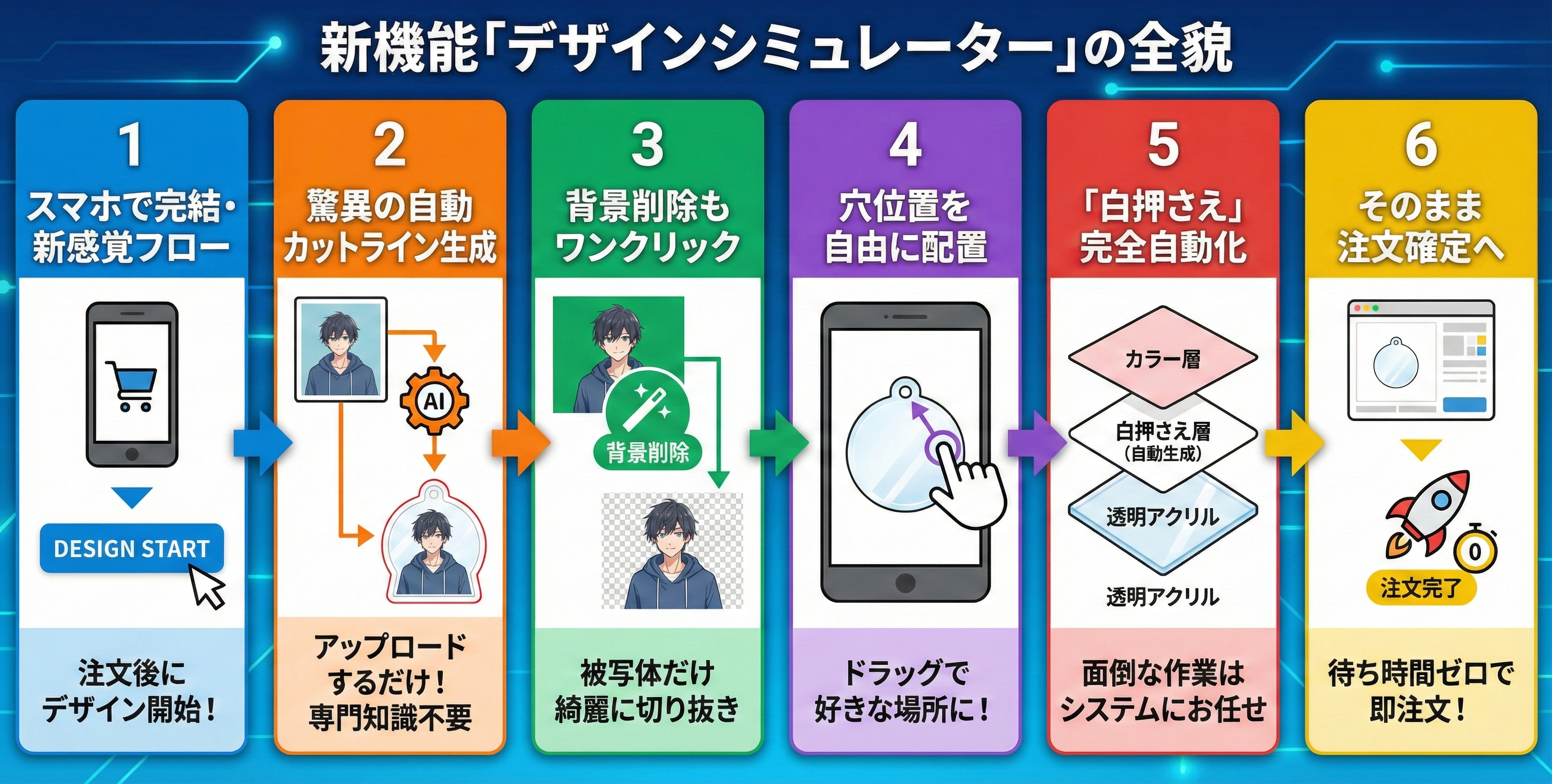 アクリルグッズ製作で初心者が最も悩む「白押さえ(透け防止のための白インク層)」データも、システムが裏側で自動生成します。ユーザーは表のデザインと形状を確認するだけ。面倒なレイヤー分け作業はすべてシステムにお任せください。