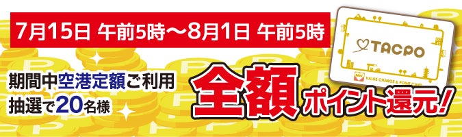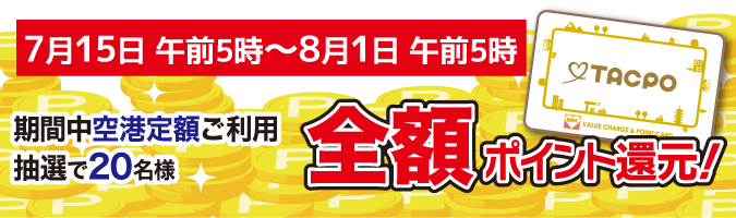期間中に名古屋MKの空港定額タクシー(セントレア空港送迎定額タクシー)をご利用の方の中から抽選で20名様限定で全額ポイント還元いたします!