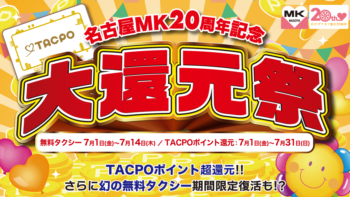 期間中、名古屋MKタクシーご乗車時にTACPOカードを提示された方全員にTACPOポイント20%還元いたします!