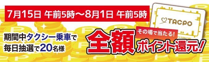 日頃よりご愛顧いただいている皆さまへの感謝の気持ちを込めて、20年前に話題となった「無料タクシー」を2週間限定で1台運行するほか、TACPOカードでお得になる3つのキャンペーンをご用意いたしました。