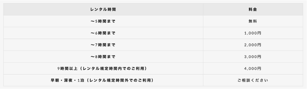 早朝や夜間、1泊でのご利用等、レンタル規定時間外でのご利用は料金をお問い合わせくださいませ。