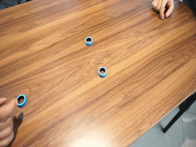 上の画像のように6つのリングを並べます。手玉をはじいて、リング同士をくっつけていくゲームです。手玉を当てたリングがくっつけば、続けて自分がプレーできます。手玉が当たったリングがくっつかなかった場合は、相手の順番になります。最後のリングをくっつけた人の勝ちです。