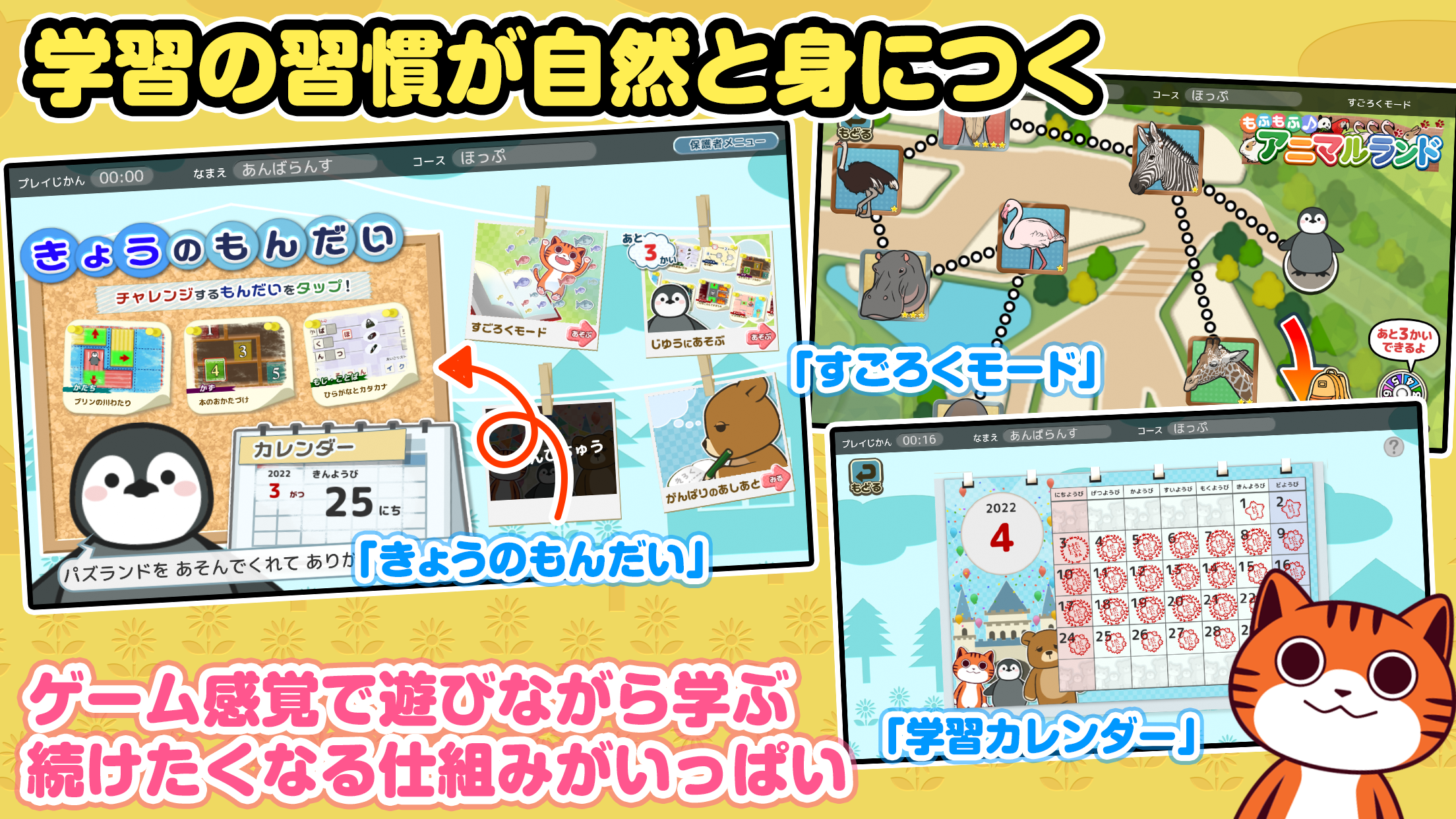 毎日更新の「きょうのもんだい」、ゲーム感覚で学習できる「すごろくモード」など、“集中して学習ができない”、“学習する習慣がなかなか身につかない”、というお子様に『楽しい学び』を提供いたします。