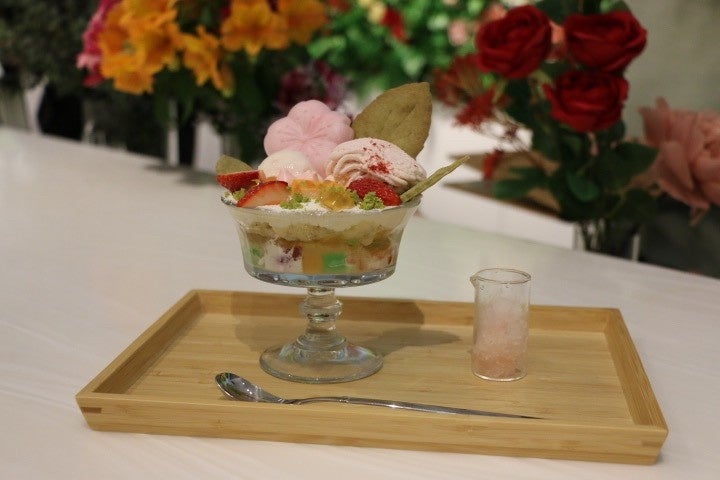 山桜をモチーフとした、さくらが香る春らしいパフェです。山桜の花言葉は「あなたにほほえむ」。パフェは下層から、寒天3種、桜パンナコッタ、アマレットゼリー、桜シフォン、クレームダンジュ。その上に、桜モンブラン、桜アイス、桜葉クッキーが添えられています。ショットグラスの桜グラニデを添えてお召し上がりください。