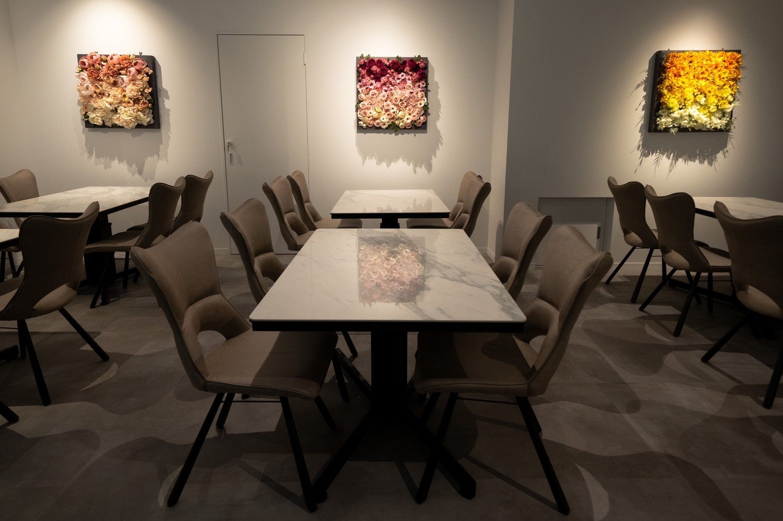 「MONE(モネ)」は、印象派画家のクロード・モネをイメージした15m×2mの巨大ウォールアートに約2,000本の生花が飾られた店内で、花を体験できる唯一無二のアートダイニング&バーです。MONEの特長的で独自のサービスは、「フラワーチャージ」。入店時に、お通しの代わりに飾られた花の中から好きな花を一輪選び、テーブルの花瓶に挿して眺めながら、飲食を楽しむことができます(1輪のサービスチャージ500円~)。目で見て楽しむだけでなく、花をモチーフとした彩り華やかな料理・ドリンクメニューも取り揃えています。