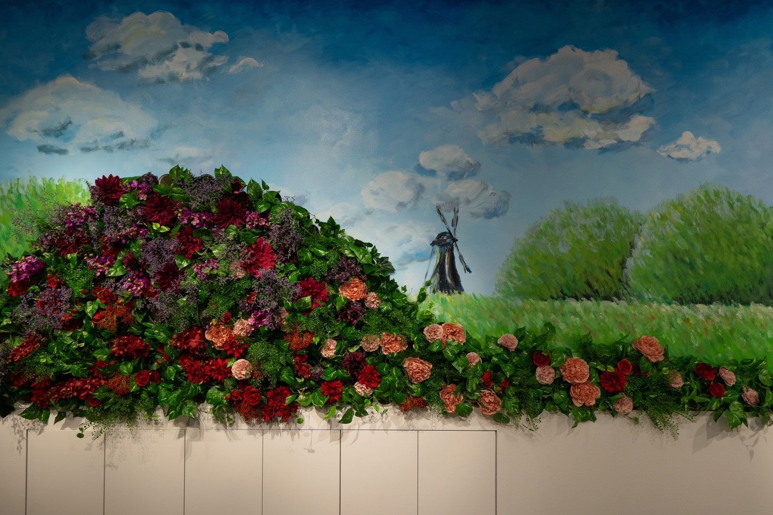 巨大なキャンバスには筆だけでなく手を使って大胆にストロークを残しながら気持ちよく描かせていただきました。人を花でつなげるコンセプトということで、お客様には実際にお庭にあるお花を摘む感覚で選んでいただけるように絵と花の自然な調和を大事にしました。 まるで自分が絵の中に入り込めるような、その絵のストーリーの一部になれるような気持ちになっていただけたら嬉しいです。