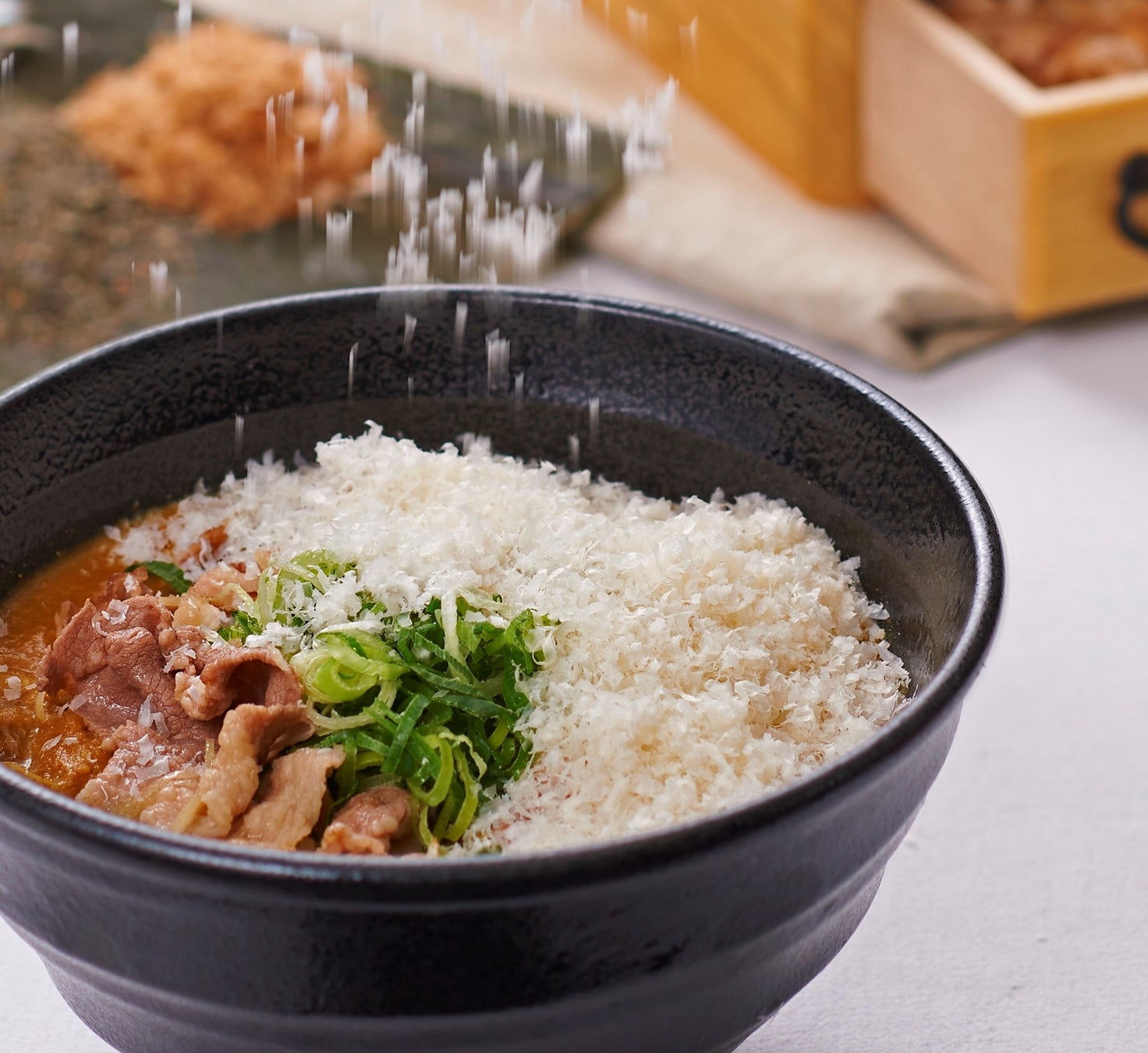 野菜たっぷり、スパイスを効かせた農園カレーに、パルミジャーノ・レッジャーノをたっぷり振りかける【チーズカレーお出汁うどん EN】阪急西宮ガーデンズに、2022年3月8日オープン!