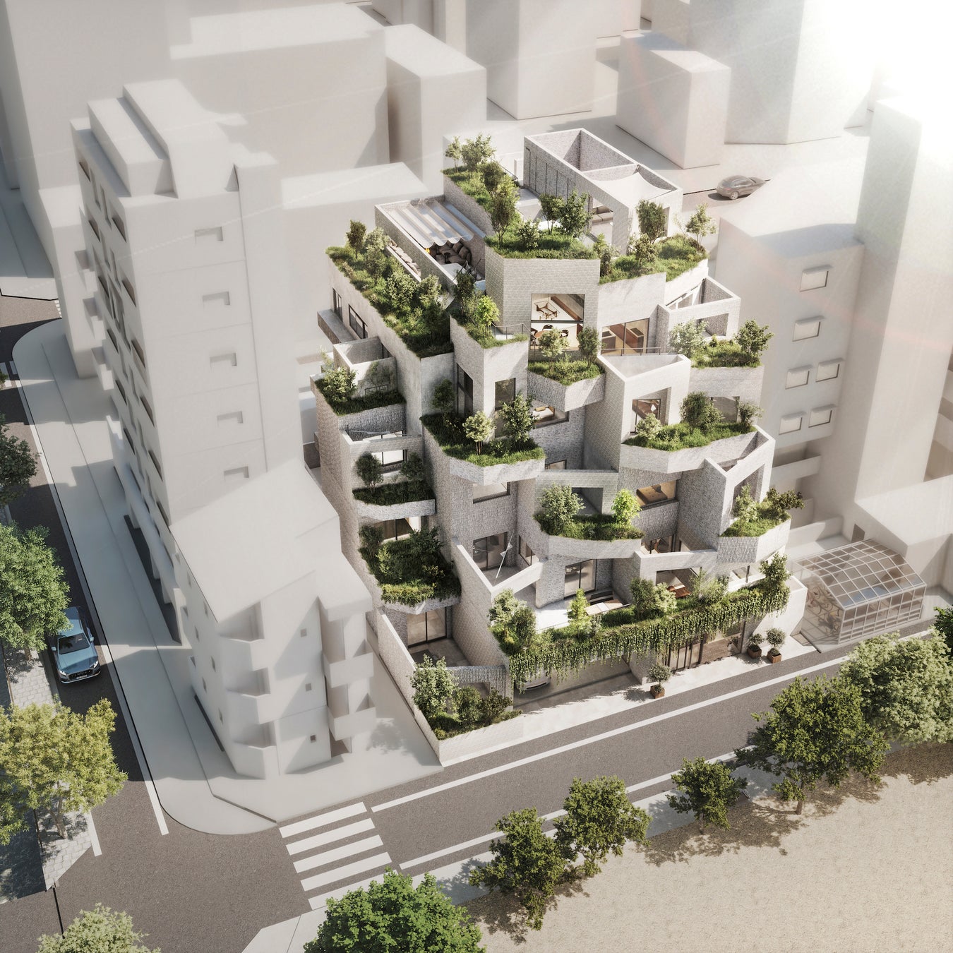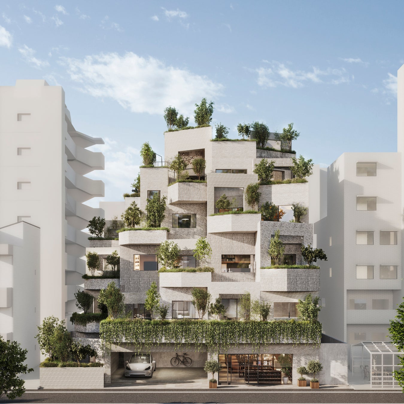 福岡中心街の喧騒から少し離れ、植栽によって街との境界を曖昧に。福岡らしい暮らしに溶け込む空気を纏う建築です。